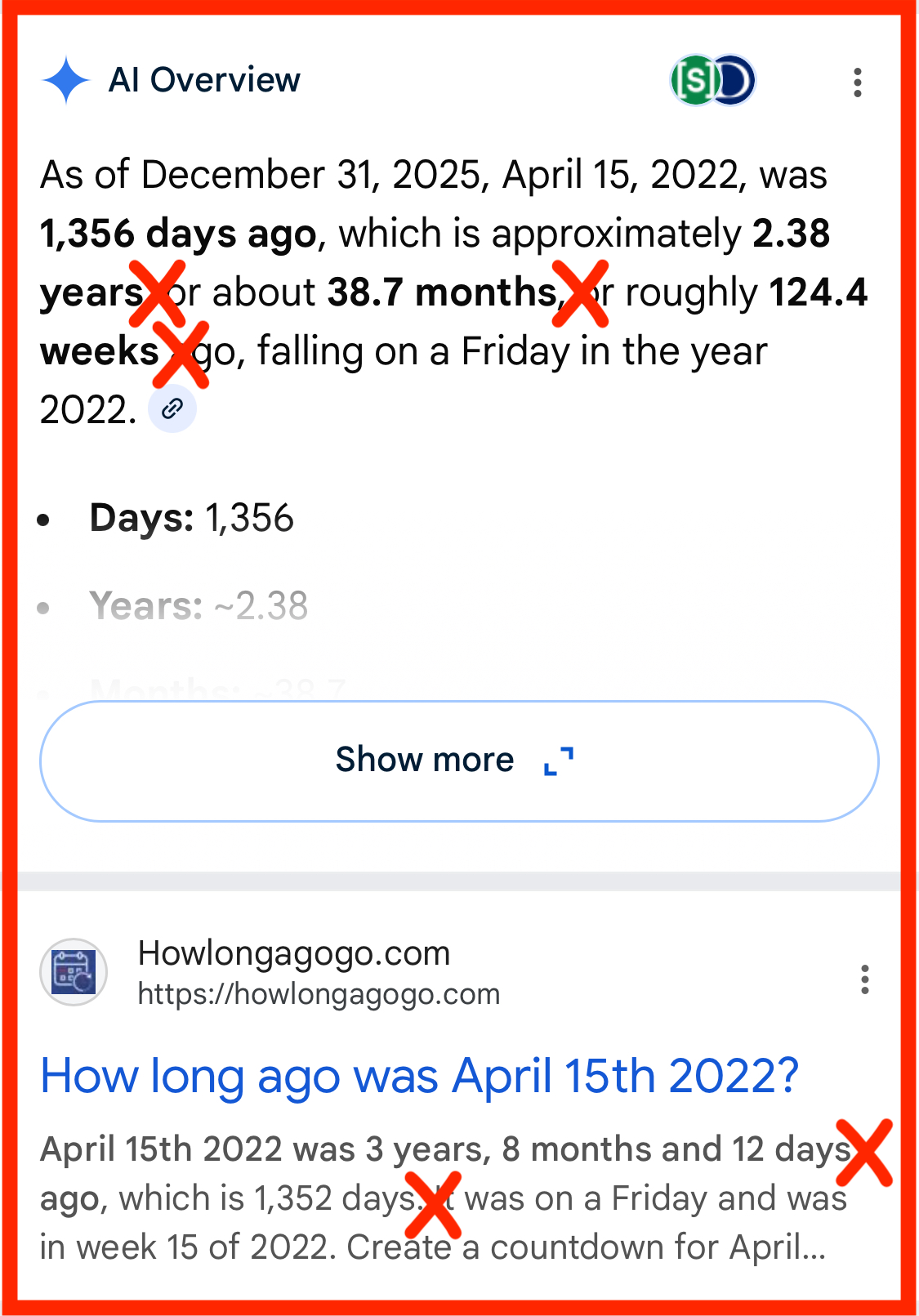 Exhibit A: A simple google search for the interval between dates (April 15, 2022, and December 31, 2025) yielded this convincing answer via Google’s Gemini AI. I was looking for a date to see if a product was still covered by warranty, so the years calculation was particularly relevant.